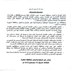 تابع شيوخ وأعيان محافظة المهرة، اليوم الثلاثاء 30 ديسمبر 2025م، القرارات السيادية الصادر...