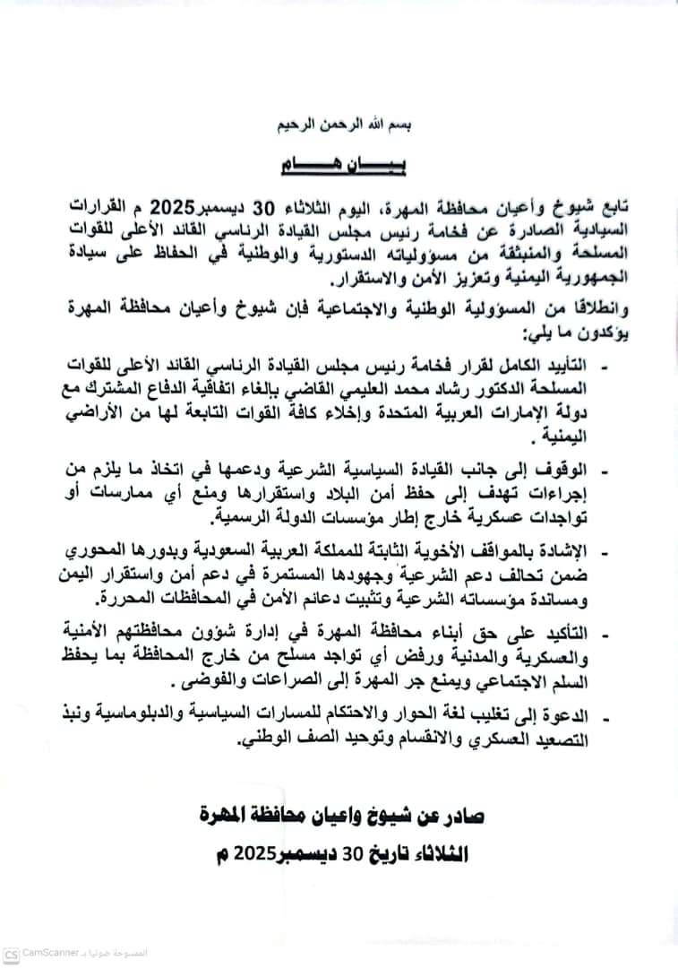 وأكد شيوخ وأعيان المهرة، في بيان صادر عنهم، تأييدهم الكامل لقرارات القيادة الرئاسية، وعلى رأسها قرار الدكتور رشاد محمد العليمي القاضي بإلغاء اتفاقية الدفاع المشترك مع دولة الإمارات العربية المتحدة، وإخلاء كافة القوات التابعة لها من الأراضي اليمنية، بما ينسجم مع مقتضيات السيادة الوطنية والمصلحة العامة.
