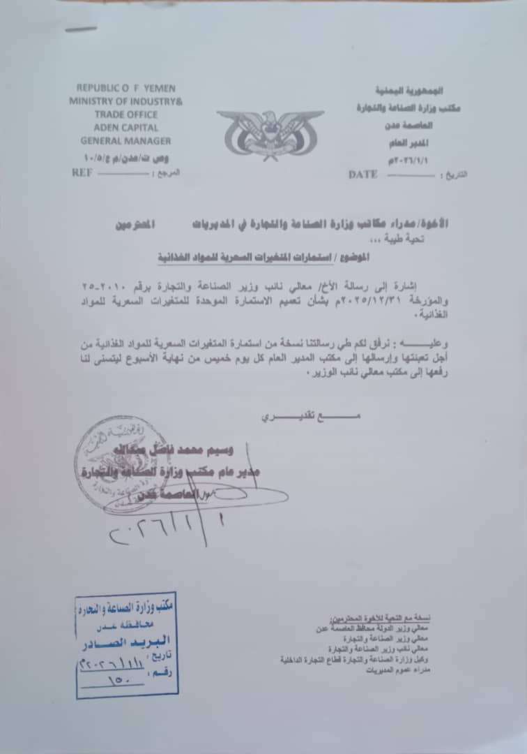 بدأ مكتب الصناعة والتجارة بتنفيذ توجيهات وزير الدولة محافظ عدن أحمد حامد لملس ونائب وزير الصناعة والتجارة سالم الوالي حيث أعطت التوجيهات لمكتب الصناعة والتجارة بعدن من قبل وسيم محمد فاضل بتنفيذ التوجيهات لكافة مكاتب الوزارة في المديريات بمتابعة المتغيرات السعرية للسلغ الغدائية ونزول اللجان بعملية فحص الأسعار في المحلات التجارية و السوبرات والبقالات ابتداءا من يومنا الخميس.