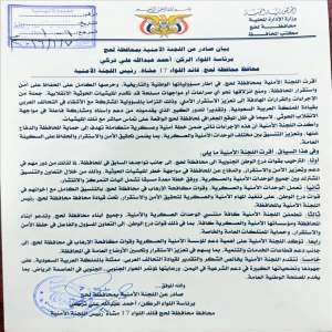 عاجل : اللجنة الأمنية بمحافظة لحج تعلن دعمها للتحالف العربي وتؤيد دخول قوات درع الوطن