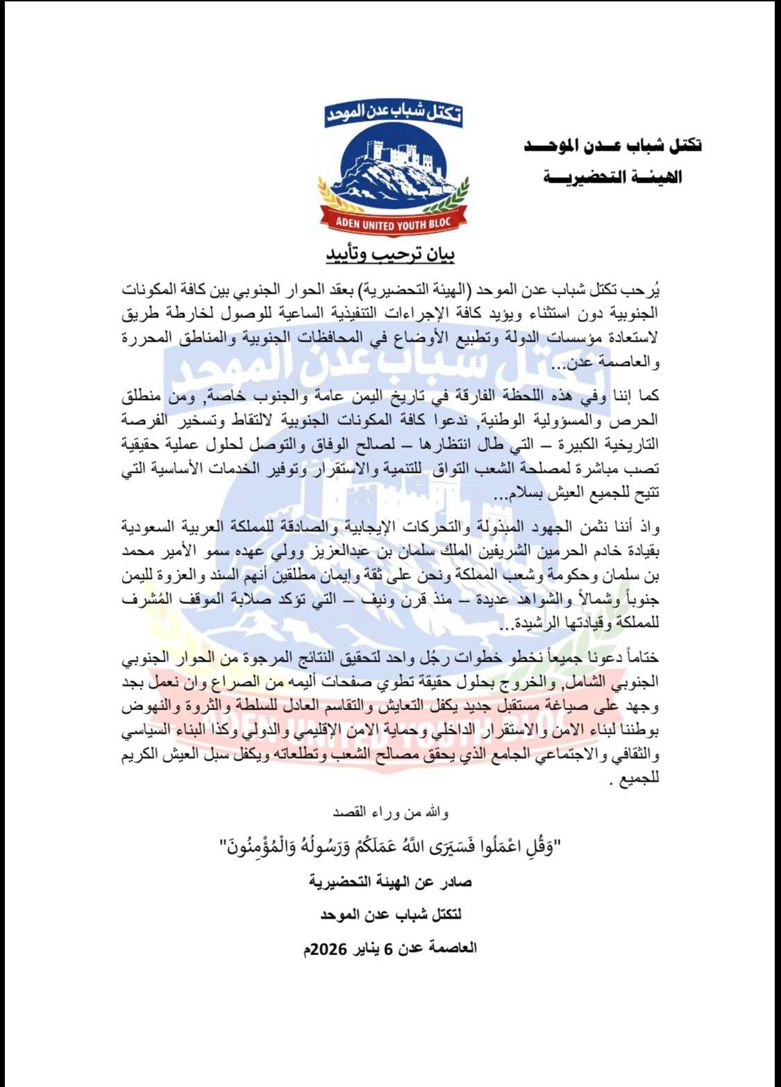ودعا البيان جميع المكونات الجنوبية إلى توحيد الصفوف والعمل بروح الشراكة والتوافق، بما يضمن طي صفحات الصراع وصياغة مستقبل جديد قائم على التعايش، والتقاسم العادل للسلطة والثروة، وبناء دولة مؤسسات تحقق الأمن والاستقرار الداخلي، وتسهم في حماية الأمن الإقليمي والدولي.