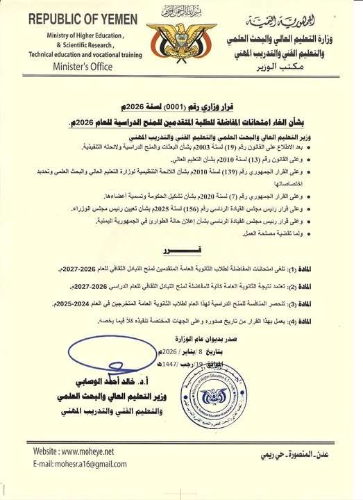 أصدر معالي وزير التعليم العالي والبحث العلمي والتعليم الفني والتدريب المهني، الأستاذ الدكتور خالد أحمد الوصابي، اليوم الخميس 8 يناير 2026م، القرار الوزاري رقم (0001) بشأن تنظيم عملية القبول للمنح الدراسية الخارجية للعام الدراسي القادم.
