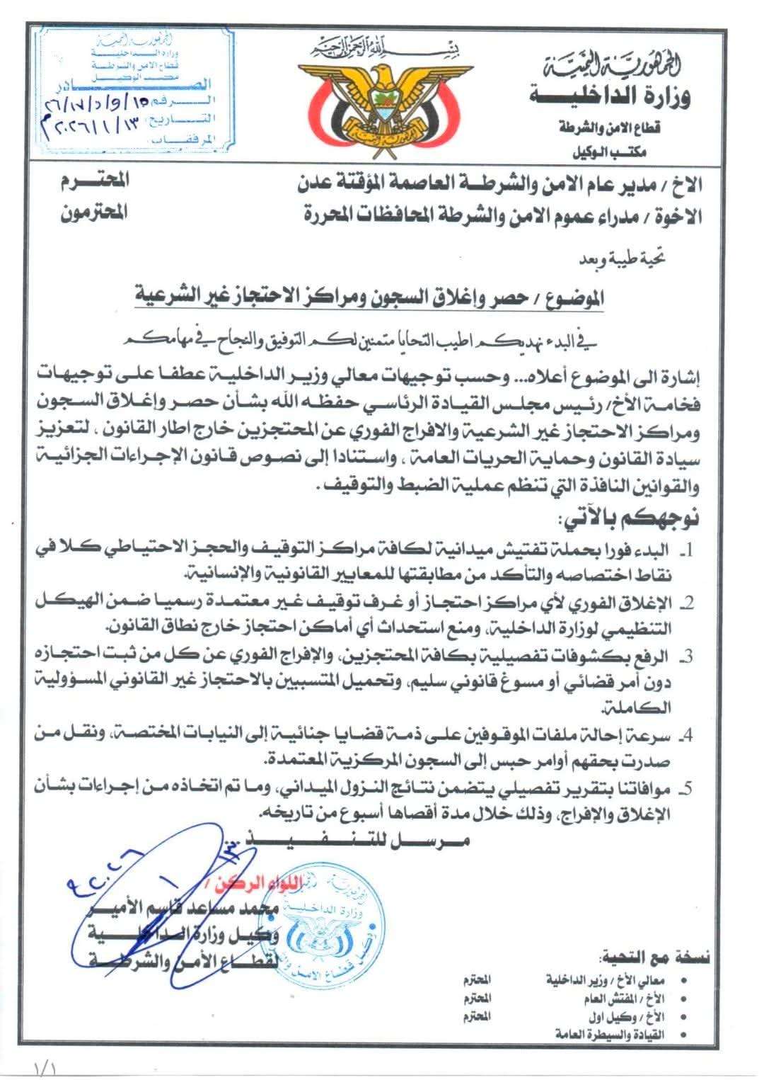 أصدرت وزارة الداخلية اليمنية، اليوم الثلاثاء 13 يناير 2026م، تعليمات صارمة إلى مدير عام الأمن والشرطة بالعاصمة المؤقتة عدن ومدراء أمن المحافظات المحررة، تقضي بالبدء الفوري في حصر وإغلاق كافة السجون ومراكز الاحتجاز غير الشرعية.