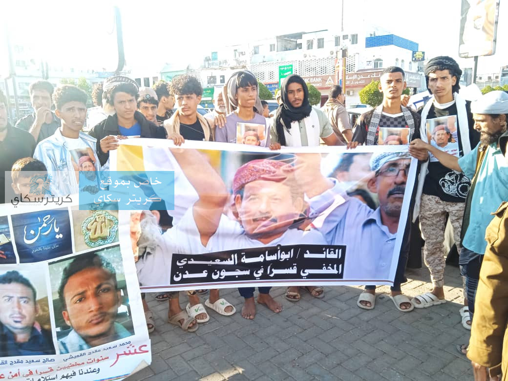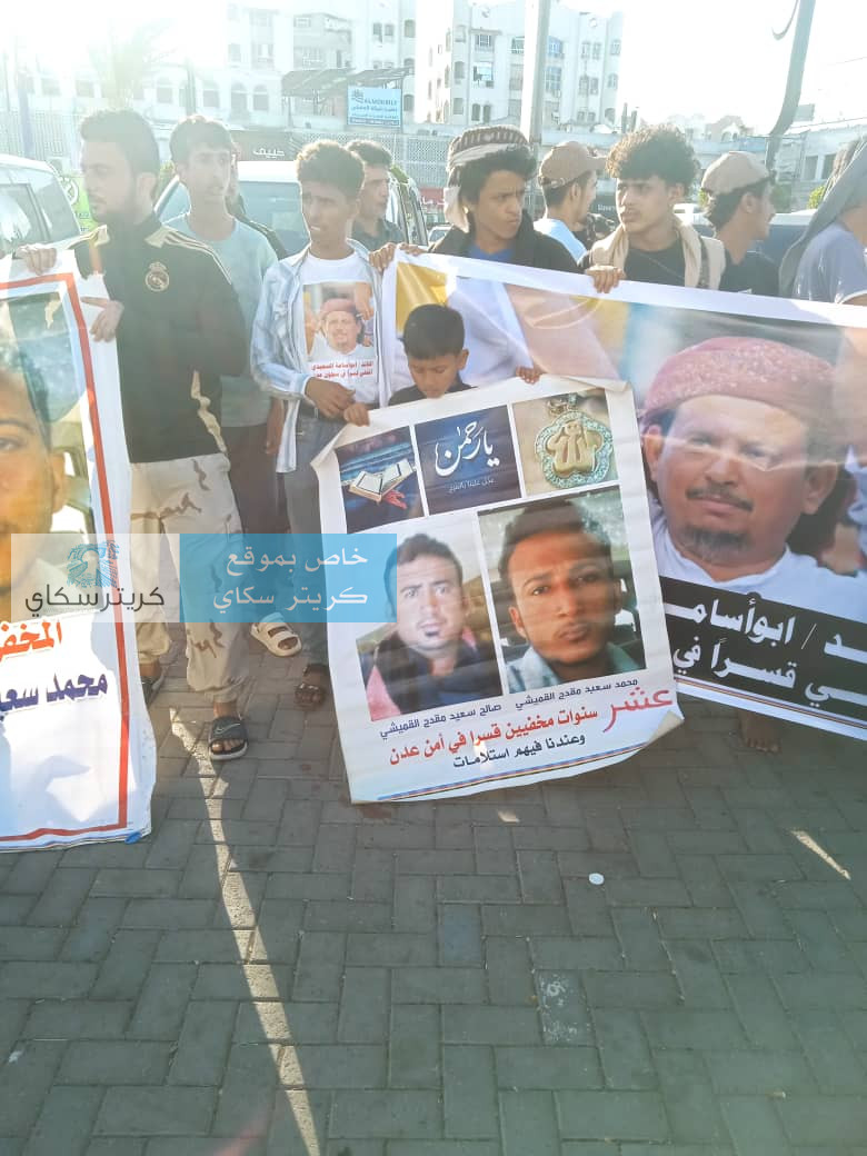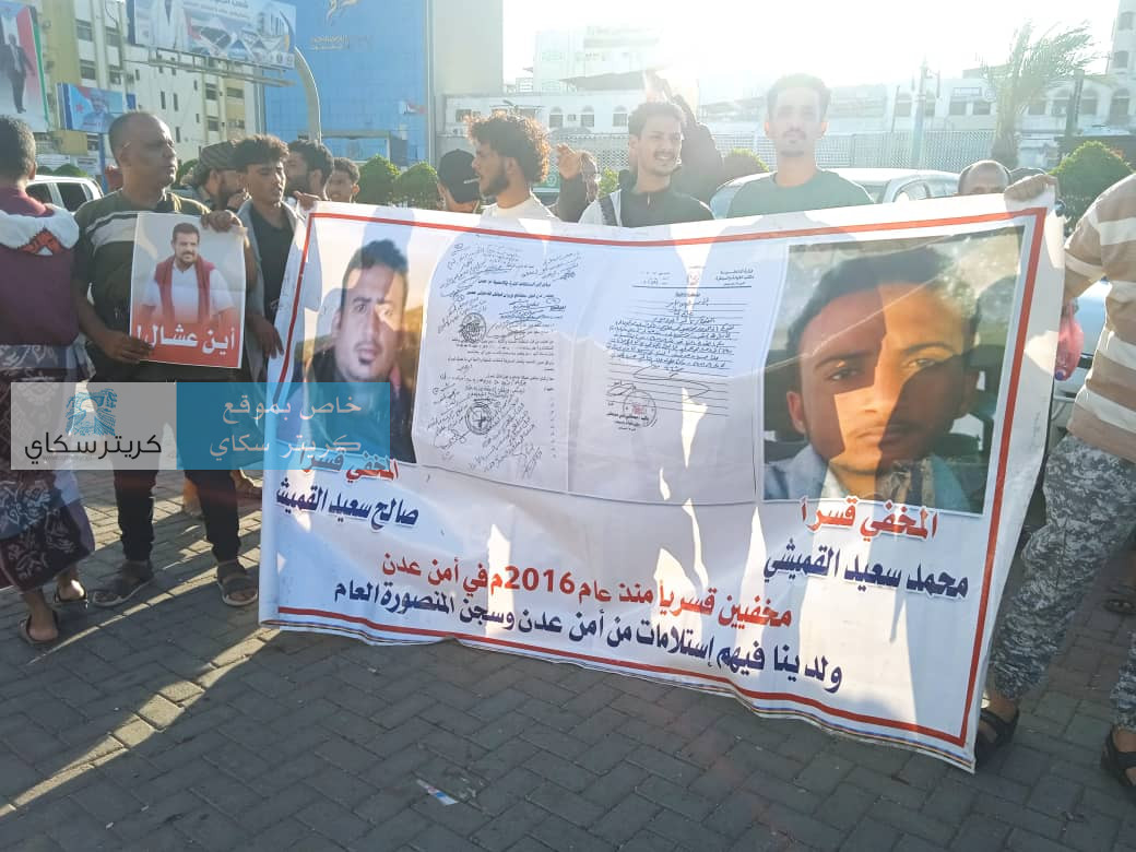 فرّقت قوات أمنية، عصر اليوم الخميس، وقفة احتجاجية سلمية في ساحة العروض بمديرية خور مكسر بالعاصمة المؤقتة عدن، كانت تطالب بالكشف عن مصير المعتقلين والمخفيين قسراً.