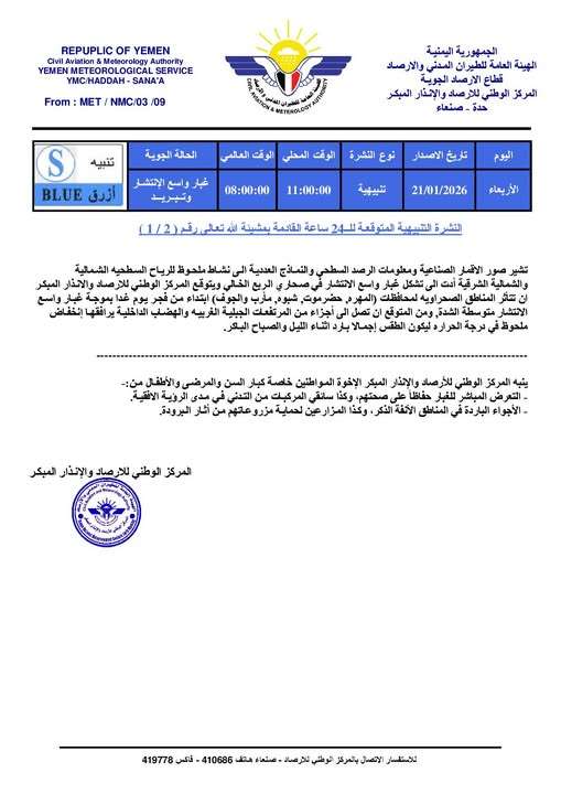 أصدر المركز الوطني للأرصاد والإنذار المبكر، اليوم الأربعاء، نشرة تنبيهية رقم (2/1) بشأن الحالة الجوية المتوقعة خلال الـ 24 ساعة القادمة، محذراً من موجة غبار واسعة الانتشار يرافقها انخفاض في درجات الحرارة.