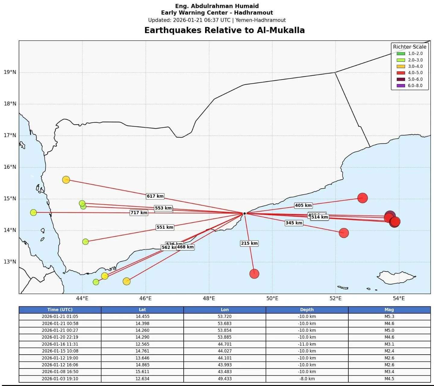 وأشار مرصد مركز الإنذار إلى أن هذه الهزة ربما كانت محسوسة لدى بعض السكان في المناطق الساحلية لمحافظات سقطرى والمهرة وحضرموت، نظراً لقوتها النسبية وموقعها الجغرافي.