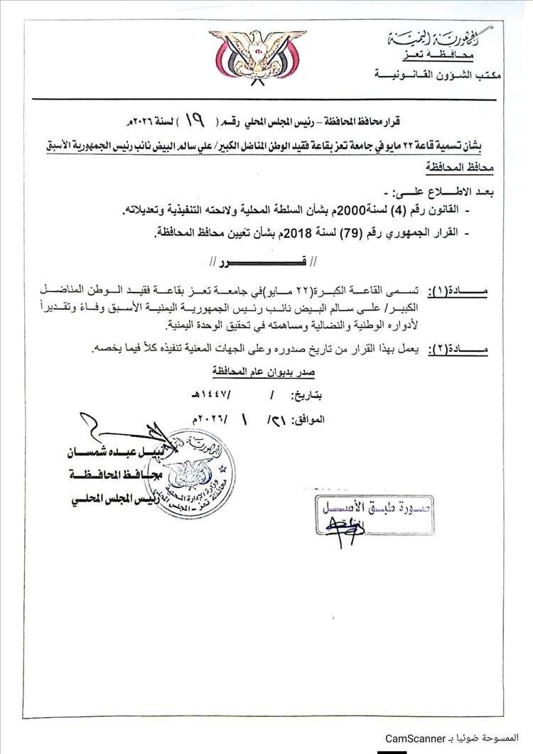 أصدر محافظ محافظة تعز، رئيس المجلس المحلي، الأستاذ نبيل عبده شمسان، اليوم القرار رقم (19) لسنة 2026م، القاضي بتسمية القاعة الكبرى "22 مايو" في جامعة تعز باسم المناضل الكبير علي سالم البيض، نائب رئيس الجمهورية اليمنية الأسبق، تقديراً لدوره الوطني وإسهاماته في مسيرة الكفاح الوطني، وتعزيز قيم الحرية والوحدة والعدالة في اليمن.