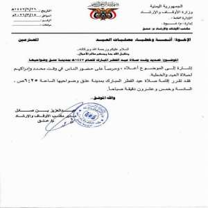 أعلن مكتب الأوقاف والإرشاد في مدينة عتق بمحافظة شبوة عن تحديد موعد إقامة صلاة عيد الفطر المبارك لعام...