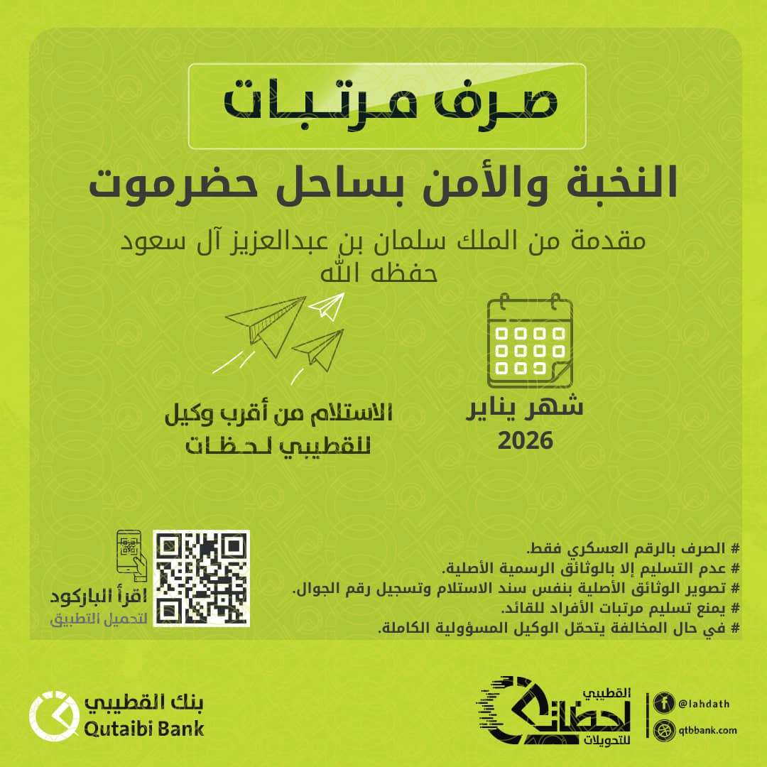 أعلنت الجهات المعنية بساحل حضرموت، اليوم، عن البدء بعملية صرف مرتبات منتسبي قوات النخبة الحضرمية والأجهزة الأمنية لشهر يناير 2026م.
