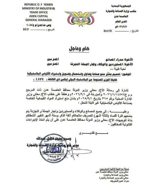 أعلنت وزارة التجارة والصناعة في عدن، ولأول مرة، حظر صناعة وتداول أكياس البلاستيك، في خطوة تهدف إلى الحد من التلوث الكيميائي والحفاظ على البيئة والصحة العامة.