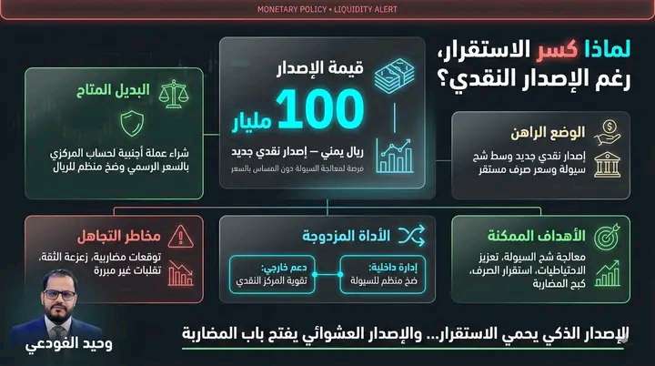 جاء ذلك في تعليقه على قرار البنك المركزي اليمني بإصدار نقدي جديد، متناولًا سبل توظيفه لمعالجة الاختلالات في السوق النقدية والحفاظ على استقرار سعر الصرف.