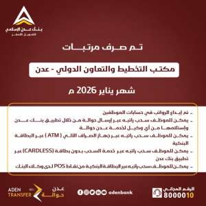 أُعلن عن صرف مرتبات موظفي مكتب التخطيط والتعاون الدولي في عدن لشهر يناير 2026م، حيث تم إيداع الرواتب...