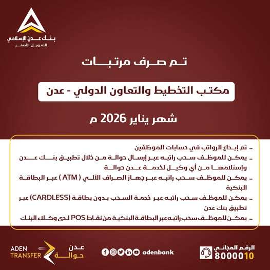 أُعلن عن صرف مرتبات موظفي مكتب التخطيط والتعاون الدولي في عدن لشهر يناير 2026م، حيث تم إيداع الرواتب في الحسابات البنكية للموظفين.