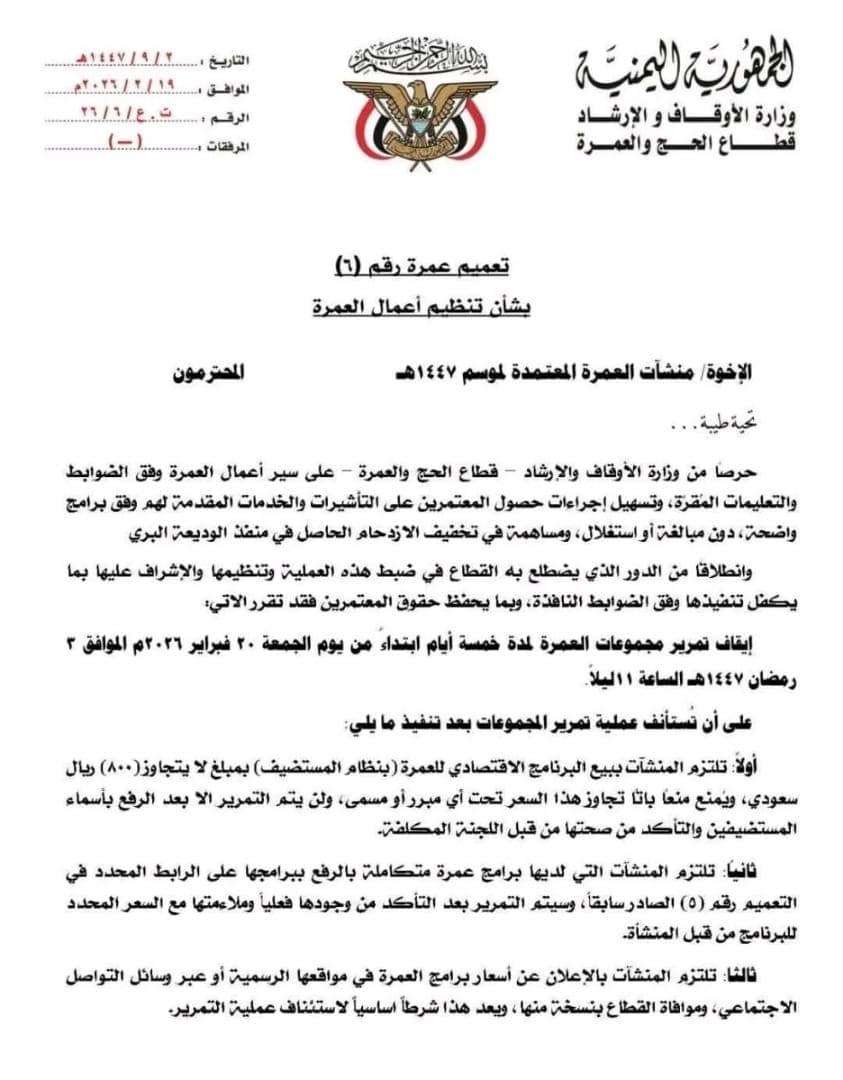 إلى ذلك قررت وزارة الأوقاف إيقاف تمرير مجموعات العمرة لمدة خمسة أيام، ابتداء من يوم غد الجمعة 20 فبراير 2026 الموافق 3 رمضان 1447، الساعة 11 ليلاً، وذلك حرصاً منها على التخفيف من الإزدحام في منفذ الوديعة الحدودي مع المملكة العربية السعودية.