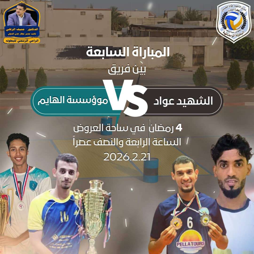 تتجه أنظار عشاق الكرة الطائرة في العاصمة عدن، في هذه اللحظات، نحو ساحة العروض بمديرية خورمكسر، حيث تدور رحى مواجهة كروية من العيار الثقيل تجمع بين فريق الشهيد عواد وخصمه العنيد فريق مؤسسة الهائم.