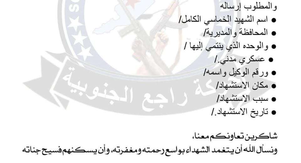 آلية التواصل: وأكد النداء أن هذا الإجراء يأتي حرصاً على توثيق بيانات القتلى بشكل صحيح وضمان حقوقهم وفاءً لتضحياتهم. وأهابت بالجميع إرسال البيانات والوثائق المطلوبة عبر تطبيق الواتساب إلى الرقم التالي: [773884837]