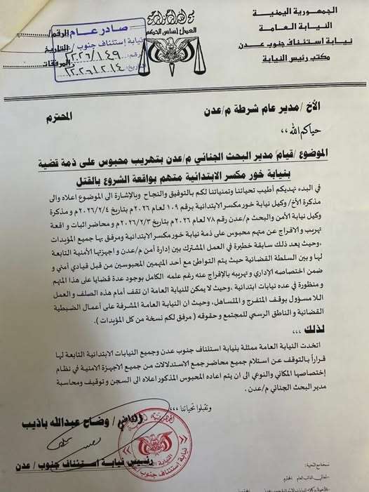 وتضمن القرار تعيين العميد حسن العمري مديرًا لإدارة البحث الجنائي في عدن خلفًا له، مع توجيهات بمواصلة التحقيق في القضية وتعزيز إجراءات الانضباط والرقابة الأمنية، بما يضمن عدم تكرار مثل هذه الحوادث.