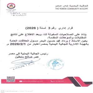 أصدر رئيس الجالية اليمنية في جمهورية مصر العربية، الأستاذ عمر صالح بابطين، القرار الإداري رقم (3) لع...