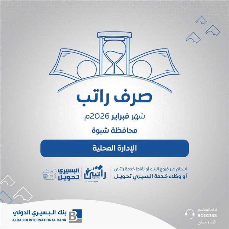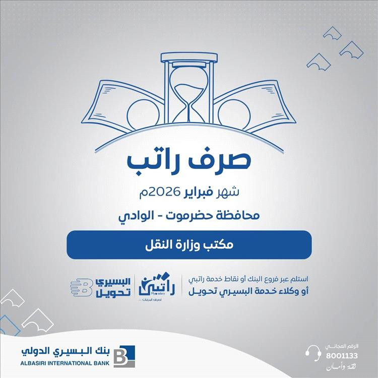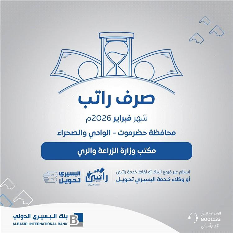 أعلن بنك البسيري الدولي عن بدء صرف مرتبات عدد من المكاتب الوزارية في محافظات شبوة وحضرموت الساحل وحضرموت الوادي، وذلك عن شهر فبراير 2026م.