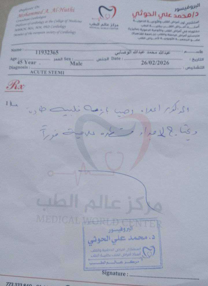 وأفادت مصادر مقربة من الأستاذ الفخري، أن الفحوصات الطبية المقررة له أكدت حاجته الماسة لتركيب "دعامات للقلب" بصورة فورية لإنقاذ حياته. وتبلغ تكلفة هذه الدعامات وحدها 3500 دولار أمريكي (ثلاثة آلاف وخمسمائة دولار)، فضلاً عن تكاليف الرقود في العناية المركزة والعلاجات المكلفة.