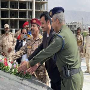 الوكيل الجيلاني واللواء اليميني والعميد الجابري يضعون إكليل الزهور على ضريح شهداء النخبة الحضرمية