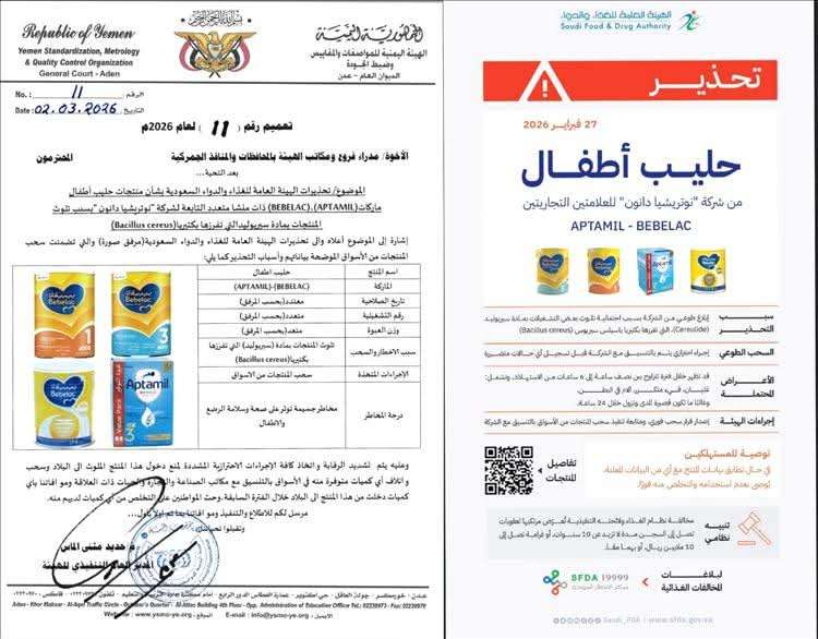 اصدرت الهيئة اليمنية للمواصفات والمقاييس وضبط الجودة اليوم الاثنين الموافق 2 مارس 2026م، تعميم برقم (11) لعام 2026م بشأن التحذيرات الصادرة عن الهيئة العامة للغذاء والدواء السعودية بخصوص سحب علامات تجارية لمنتجات حليب اطفال ملوثة .