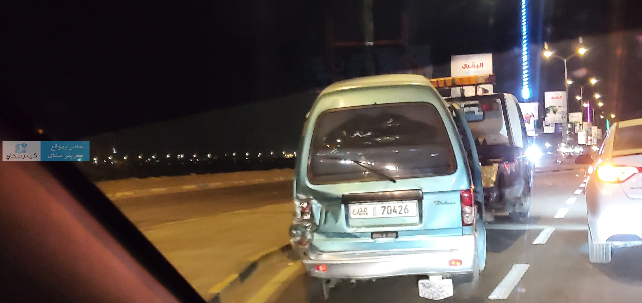 وتعرض باص دباب لحادث مروري بالطريق البحري قبل ان يتم سحبه بالونش