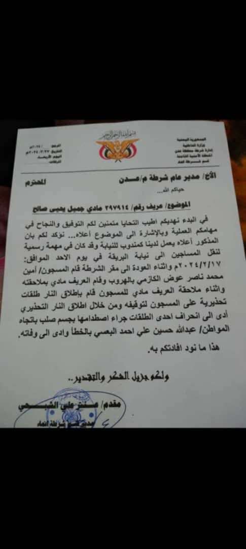 كشفت وثيقة رسمية صادرة عن جهات أمنية في عدن تفاصيل حادثة إطلاق نار وقعت أثناء تنفيذ مهمة رسمية لنقل ومرافقة سجناء، وأسفرت عن وفاة مواطن بطريق الخطأ.
