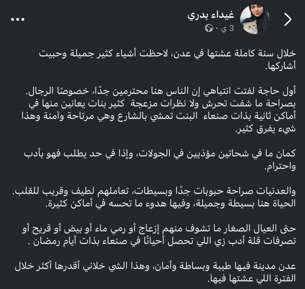 واختتمت غيداء بدري حديثها بالتأكيد على أن عدن مدينة طيبة وآمنة، مؤكدة أن تجربتها فيها جعلتها تُقدّر هذا النموذج من التعايش والهدوء خلال فترة إقامتها.