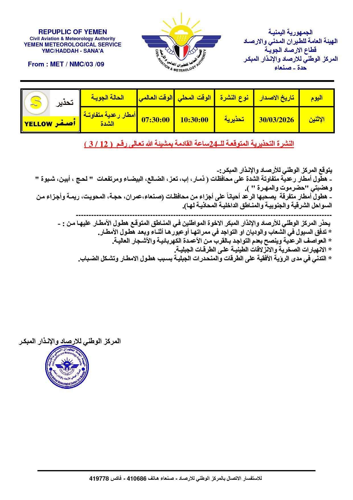 أصدر المركز الوطني للأرصاد والإنذار المبكر نشرة تحذيرية رقم (12/3) ليوم الاثنين 30 مارس 2026، يتوقع خلالها هطول أمطار رعدية متفاوتة الشدة على محافظات ذمار، إب، تعز، الضالع، البيضاء، ومرتفعات لحج، أبين، شبوة، إضافة إلى الهضاب الداخلية لمحافظتي حضرموت والمهرة.