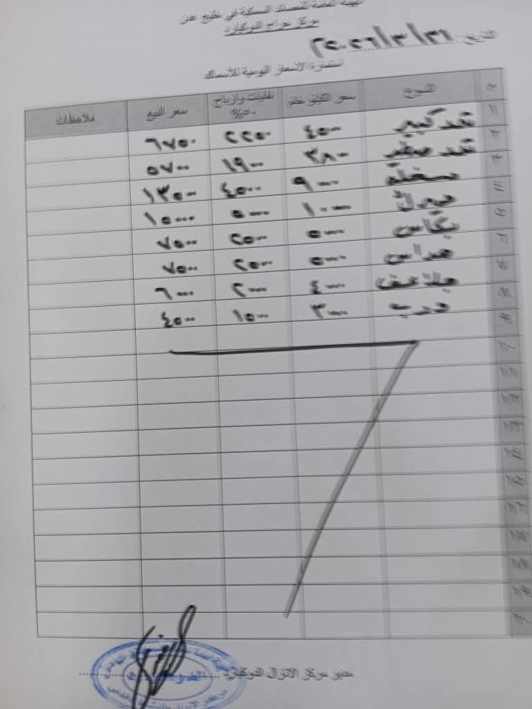 أصدر مركز الإنزال السمكي (الدوكيارد) في مديرية المعلا – عدن، اليوم الثلاثاء 31 مارس 2026م، قائمة بأسعار الأسماك المتداولة في السوق، حيث جاءت على النحو التالي: