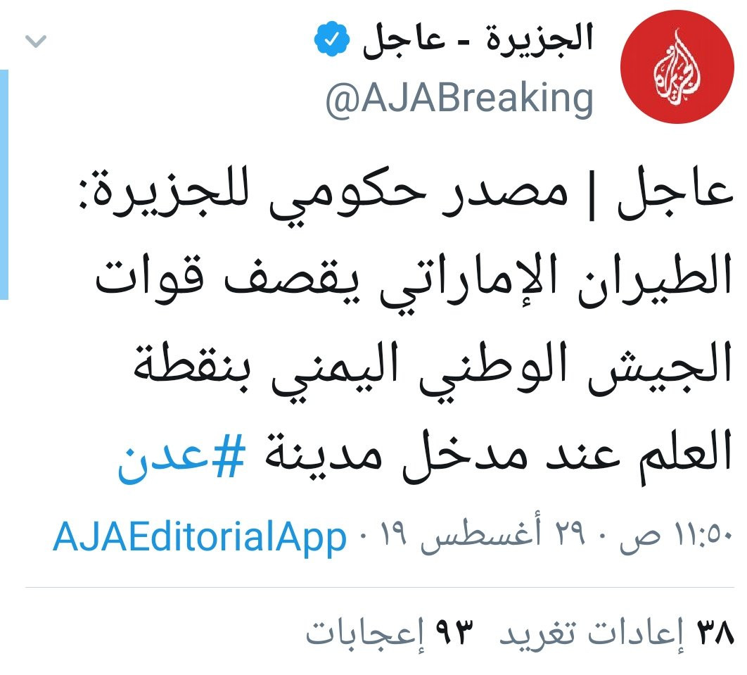 ومضى الداعري قائلا:" الجزيرة تواصل السقوط المهني بالجنوب لمحاولة إيجاد تبرير سخيف لفضيحة إسقاطها أمس لعدن بيد قوات الشرعية الاخونجية وتصل حد الزعم بمساندة الطيران الإماراتي لقوات الإنتقالي والكل يعرف من استهدفت الطائرات أمس بجولة السفينة"