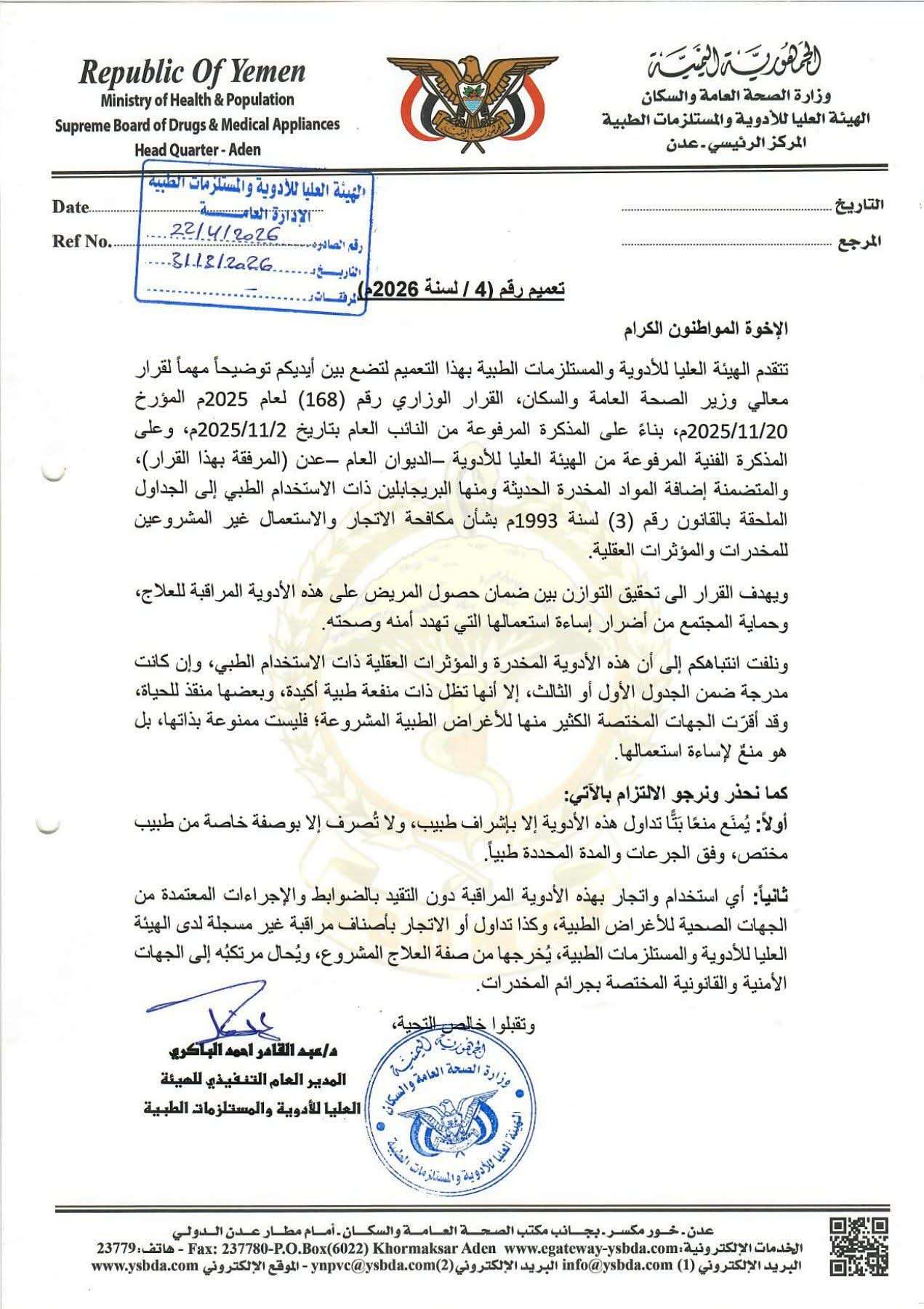 أصدرت الهيئة العليا للأدوية والمستلزمات الطبية – المركز الرئيسي عدن تعميماً هاماً بشأن تنظيم تداول الأدوية المخدرة والمؤثرات العقلية، وذلك استناداً إلى القرار الوزاري رقم (168) لعام 2025.