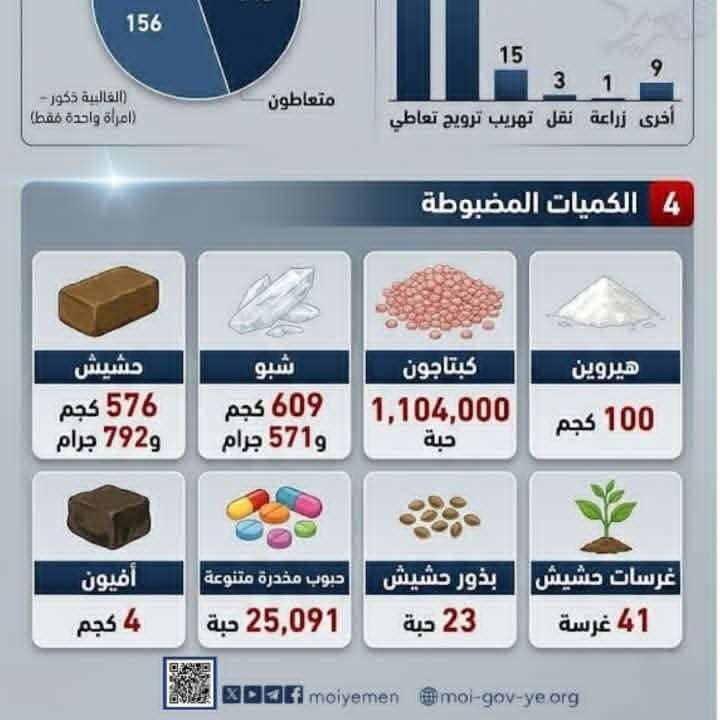 وقال مدير الإدارة، العميد عبدالله أحمد لحمدي، إن فرق مكافحة المخدرات سجلت 223 جريمة متنوعة، أبرزها الترويج والتعاطي والتهريب، مع ضبط كميات كبيرة من المواد المخدرة، منها الحشيش والشبو والهيروين، وأكثر من مليون حبة كبتاجون.