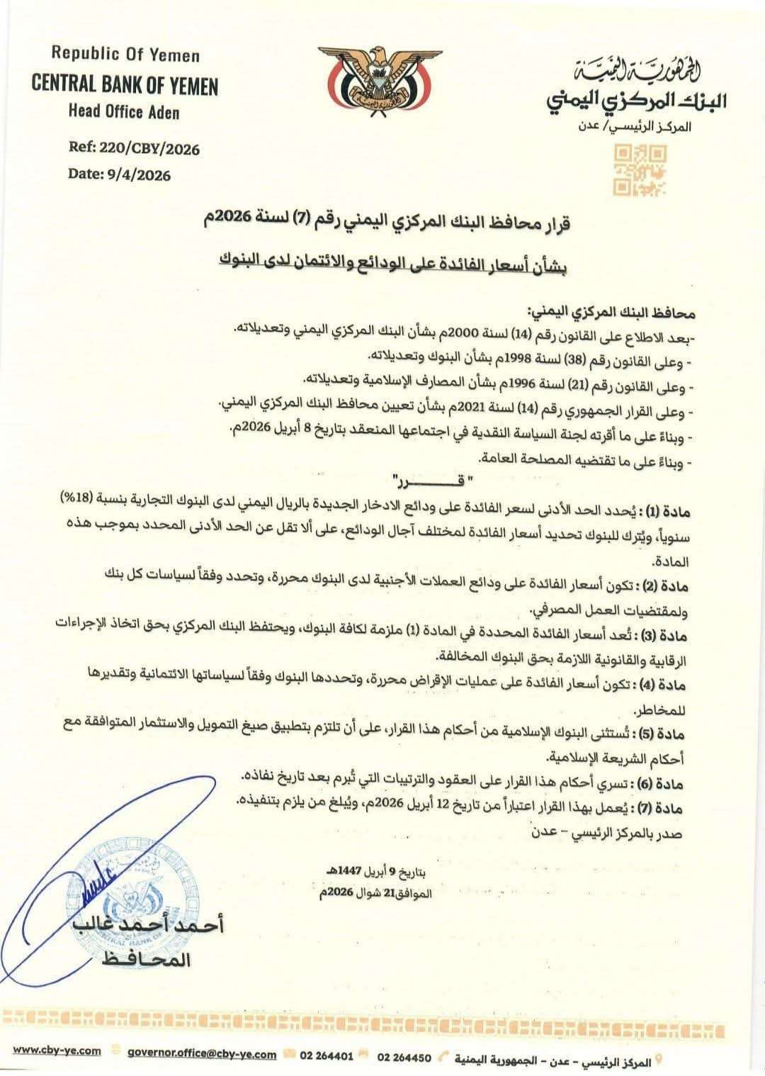 علّق الصحفي ماجد الداعري على قرار محافظ البنك المركزي القاضي بتحديد الحد الأدنى لنسبة الفائدة على ودائع الادخار الجديدة بالريال اليمني لدى البنوك التجارية بنسبة 18% سنوياً، مع إلزام البنوك بتطبيقها، إضافة إلى تحرير أسعار الفائدة على الودائع بالعملات الأجنبية.