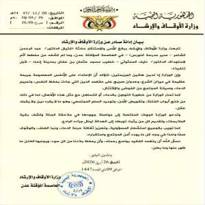 أدانت وزارة الأوقاف والإرشاد جريمة اغتيال الدكتور عبد الرحمن الشاعر، مدير مدرسة النورس، في العاصمة ا...