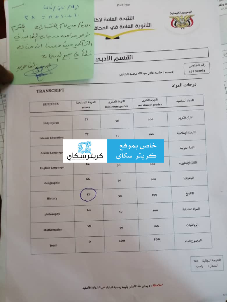 واضافوا:وقال مدير المكتي ان جمع درجاتها فقط التراكمية سيكون معدلها في مادة التاريخ28 وهم حطو لها 12 بمعنى لو ماحلت الامتحان النهائي واعطتهم الورقة دون اجابات اقل شيء بيحطوا لها 28درجة اخذنا تعليمات من الاستاذ الطاهري مدير مكتب وزير التربية والتعليم ولكن مدير الامتحانات رفض قبول التعليمات بحجة ان الوزير منع فتح باب التظلمات.