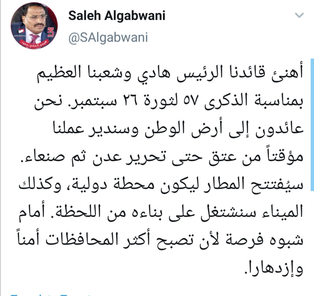 وقال الجبواني في تغريدة نشرها على صفحته بموقع تويتر:" أهنئ قائدنا الرئيس هادي وشعبنا العظيم بمناسبة الذكرى ٥٧ لثورة ٢٦ سبتمبر. نحن عائدون إلى أرض الوطن وسندير عملنا مؤقتاً من عتق حتى تحرير عدن ثم صنعاء"