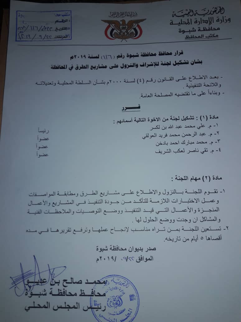 شكل محافظ محافظة شبوة محمد صالح بن عديو لجنة من المهندسين والمختصين لتنفيذ مشاريع الطرقات التي أقرتها المحافظة.