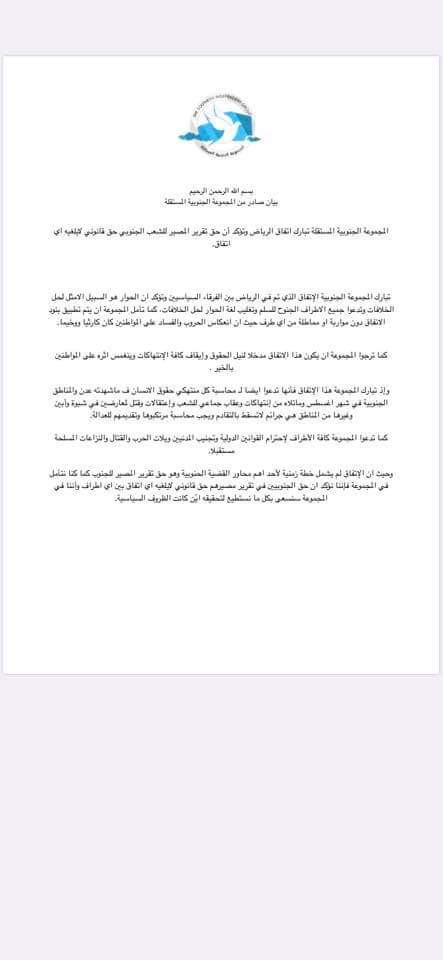 تبارك المجموعة الجنوبية الإتفاق الذي تم في الرياض بين الفرقاء السياسيين وتؤكد ان الحوار هو السبيل الامثل لحل الخلافات وتدعوا جميع الاطراف الجنوح للسلم وتغليب لغة الحوار لحل الخلافات، كما تأمل المجموعة ان يتم تطبيق بنود الاتفاق دون مواربة او مماطلة من اي طرف حيث ان انعكاس الحروب والفساد على المواطنين كان كارثيا ووخيما.