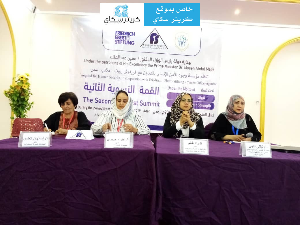 تحت شعار " النساء يصنعن السلام"، انعقدت القمة النسوية الثانية صباح اليوم الاثنين في قاعة عدن مول"الصغرى" بمشاركة عدد من التكتلات النسوية من مختلف المحافظات اليمنية.