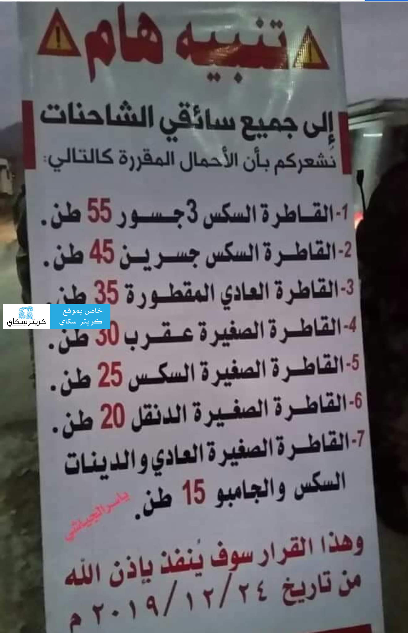 اصدرت احدى النقاط العسكرية في يافع التابعة لمحافظة لحج تعميم يتعلق بالحمولة التي يمكن حملها مالكي الناقلات الكبيرة والمتوسطة.