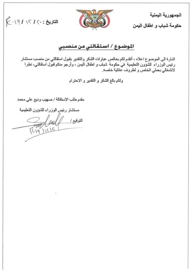 قدم صهيب وديع علي محمد مستشار رئيس الوزراء للشؤون التعليمية استقالته من حكومة شباب واطفال اليمن وذالك بسبب انشغاله في ظروف خاصة حسب ماجاء في نص البيان.