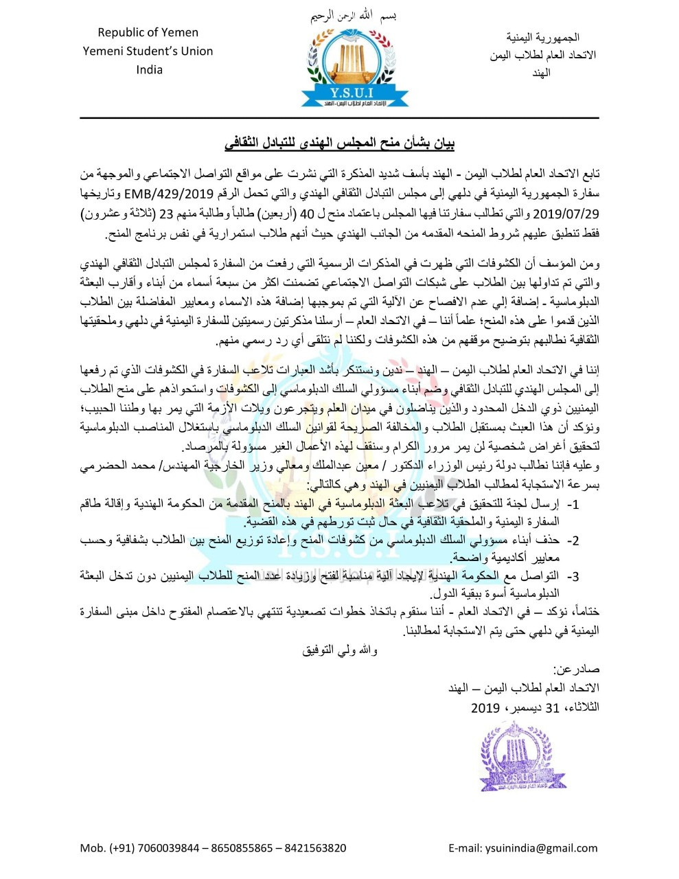 أصدر الاتحاد العام لطلاب اليمن في الهند بيانا عبر فيها عن اسفه الشديد اتجاه المذكرة التي نشرت على مواقع التواصل الاجتماعي والموجهة من سفارة الجمهورية اليمنية في دلهي إلى مجلس التبادل الثقافي الهندي والتي تحمل الرقم EMB/429/2019 وتاريخها 29/07/2019 والتي تطالب سفارتنا فيها المجلس باعتماد منح ل 40 (أربعين) طالباً وطالبة منهم 23 (ثلاثة وعشرون) فقط تنطبق عليهم شروط المنحه المقدمه من الجانب الهندي حيث أنهم طلاب استمرارية في نفس برنامج المنح.
