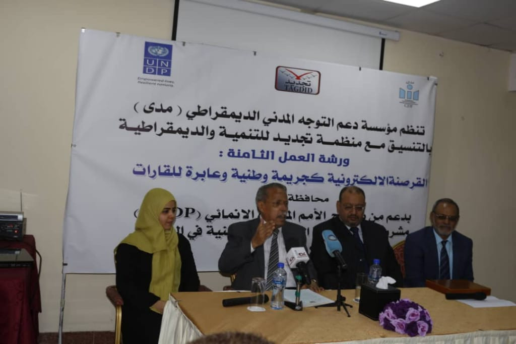 دشنت ،صباح اليوم، منظمتي مدى وتجديد ، ورشة العمل الثامنة بعنوان (القرصنة الالكترونية كجريمة وطنية وعابرة للقارات - محافظة عدن) ، وذلك ضمن مشروع دعم الاجهزة القضائية والأمنية في اليمن ، وبدعم من البرنامج الانمائي للامم المتحدة (UNDP) .
