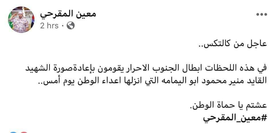 سخر نشطاء محليين من العاصمة عدن تصريحات ادلى بها معين المقرحي اركان حرب اللواء الاول دعم واسناد عن لافتة تم تغييرها في المنصورة.