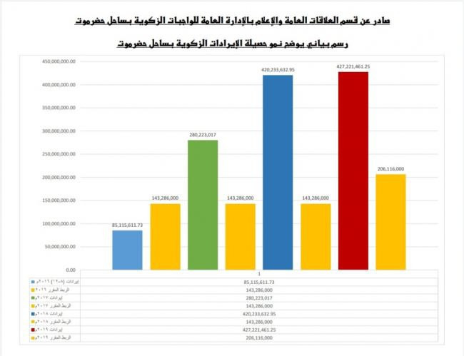 بلغت إيرادات الإدارة العامة للواجبات الزكوية بساحل حضرموت خلال العام 2019م (427,221,461.25) أربعمائة وسبعة وعشرين مليون ومائتين وواحد وعشرين ألف وأربعمائة وواحد وستون ريال وخمسة وعشرين فلس.