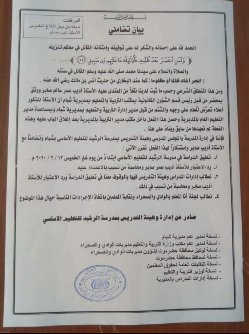 قرر منتسبي مدرسة الرشيد للتعليم الاساسي في مديرية شبام حضرموت على تنفيذ وقفة احتجاجية يوم غدا للتضامن مع معلم تعرض للاعتداء.