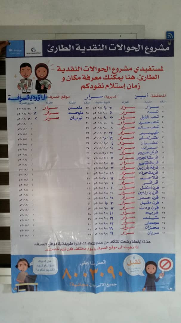 دشن صباح هذا اليوم الأحد عملية الصرف للمرحلة الثالثة لمشروع الحوالات النقدية الطارئ المقدم من البنك الدولي والممول من منظمة اليونيسف التابعة للأمم المتحدة في مديرية سرار محافظة ابين