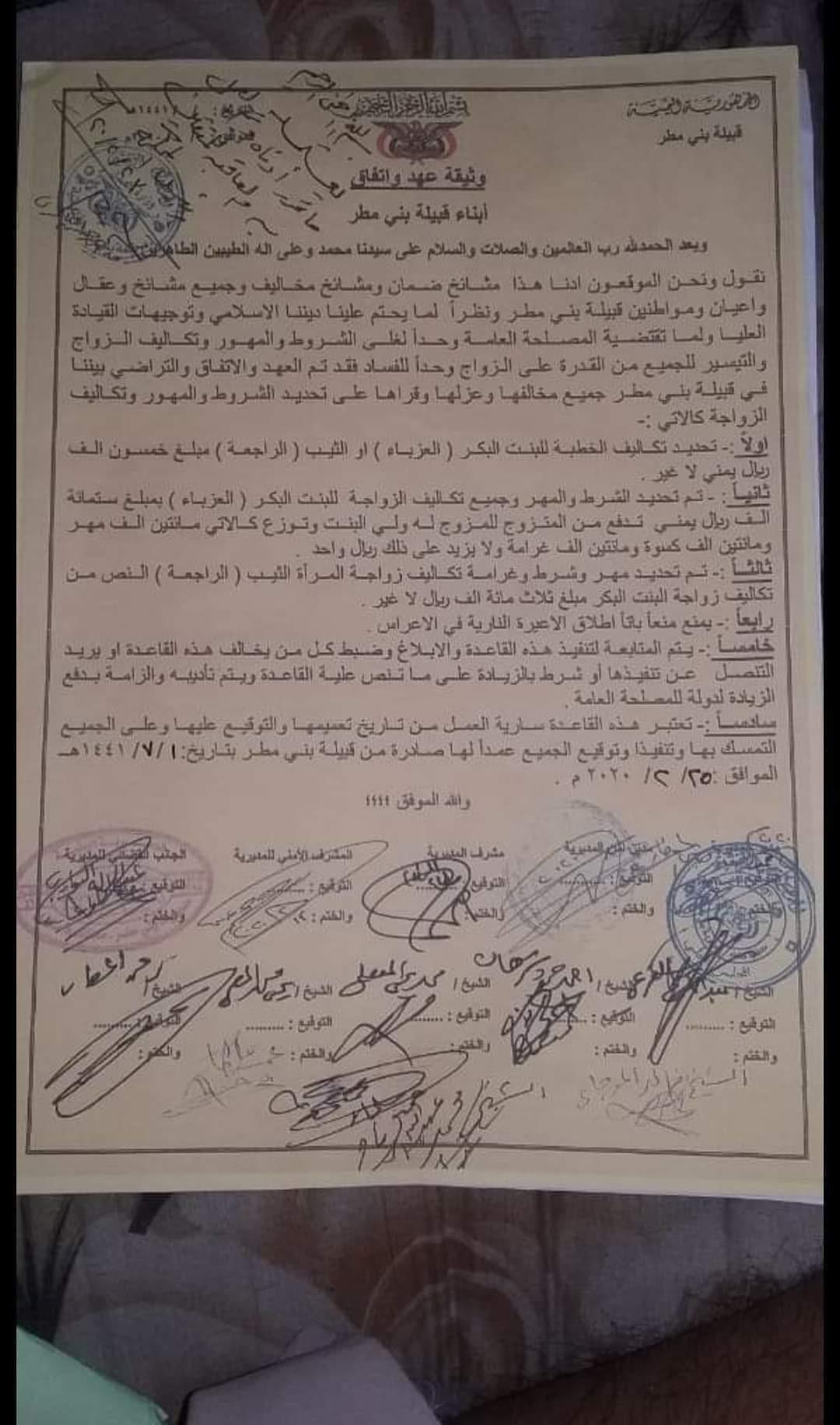 ويظهر في الوثيقة اتفاقية لاعيان ومشائخ قبيلة بني مطر في صنعاء على تحديد قيمة الزواج.